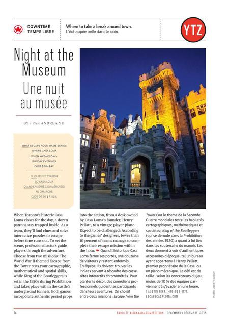 Air Canada enRoute edition • 1st December 2015 Night at the Museum When Toronto's historic Casa Loma closes for the day, a dozen patrons stay trapped inside. As a team, they'll find clues and solve interactive puzzles to escape before time runs out.